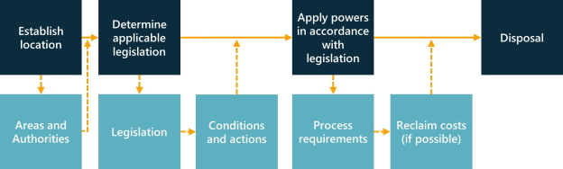 There is also currently no clear guidance in the UK that provides determining factors for removal, nor clear definitions of dereliction, seaworthiness, marine waste, etc. This means that both port and local authorities must find solutions for their removal at their own expense, with limited opportunity for reimbursement. The diagram below shows the process for removing a derelict vessel or debris under current UK legislation.